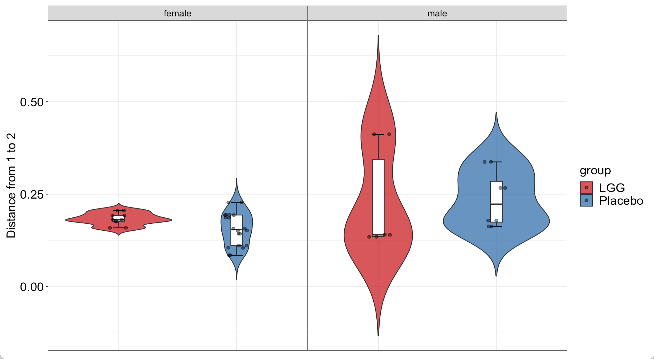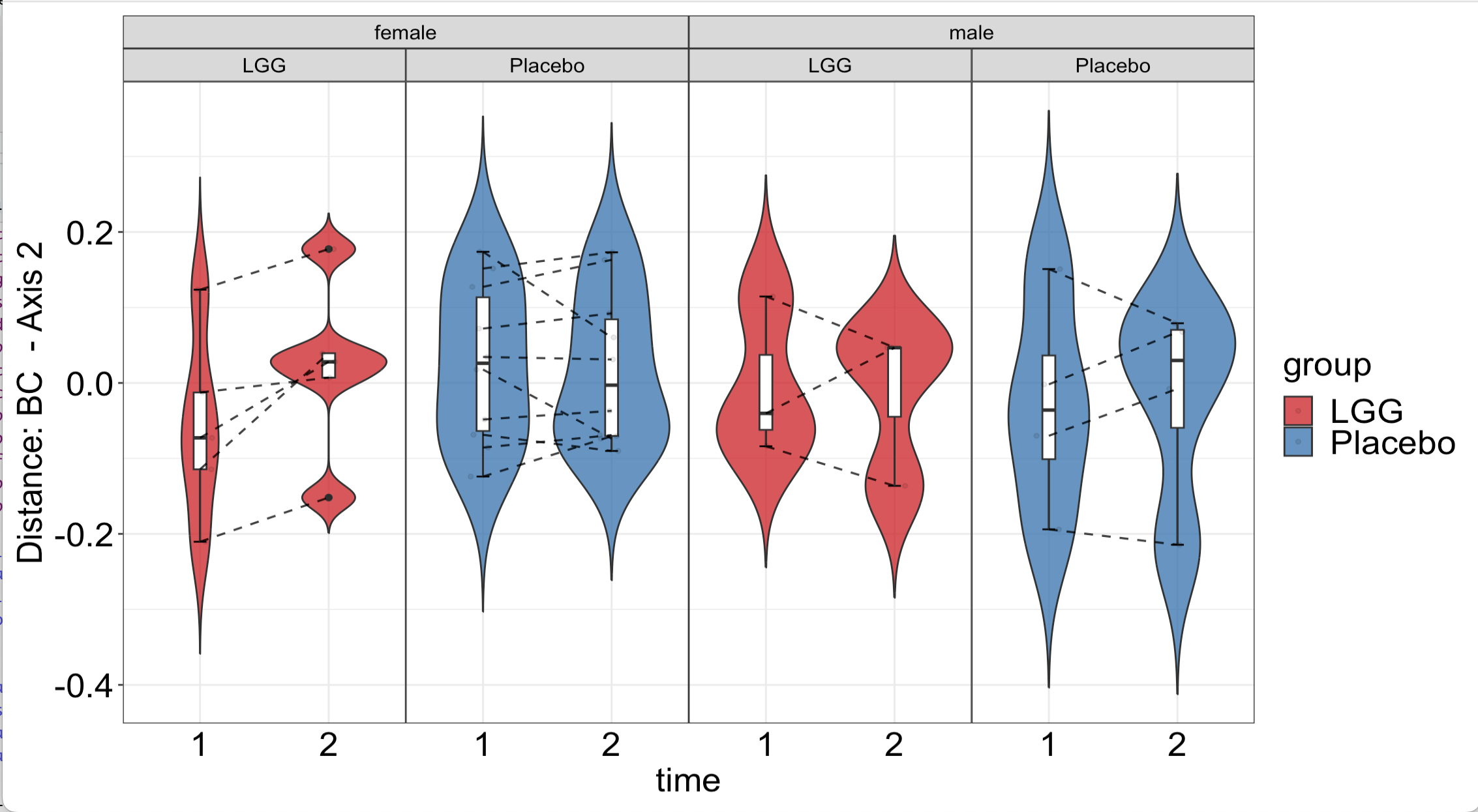 <table><thead><tr><th width="134">Distance</th><th>Term</th><th>Estimate</th><th>Std.Error</th><th>Statistic</th><th>P.Value</th></tr></thead><tbody><tr><td>BC</td><td>(Intercept)</td><td>0.175</td><td>0.0186</td><td>9.42</td><td>8.24e-12</td></tr><tr><td>BC</td><td>sexmale</td><td>0.0671</td><td>0.0217</td><td>3.09</td><td>3.58e-3</td></tr><tr><td>BC</td><td>groupPlacebo</td><td>-0.0157</td><td>0.0210</td><td>-0.746</td><td>4.60e-1</td></tr></tbody></table>